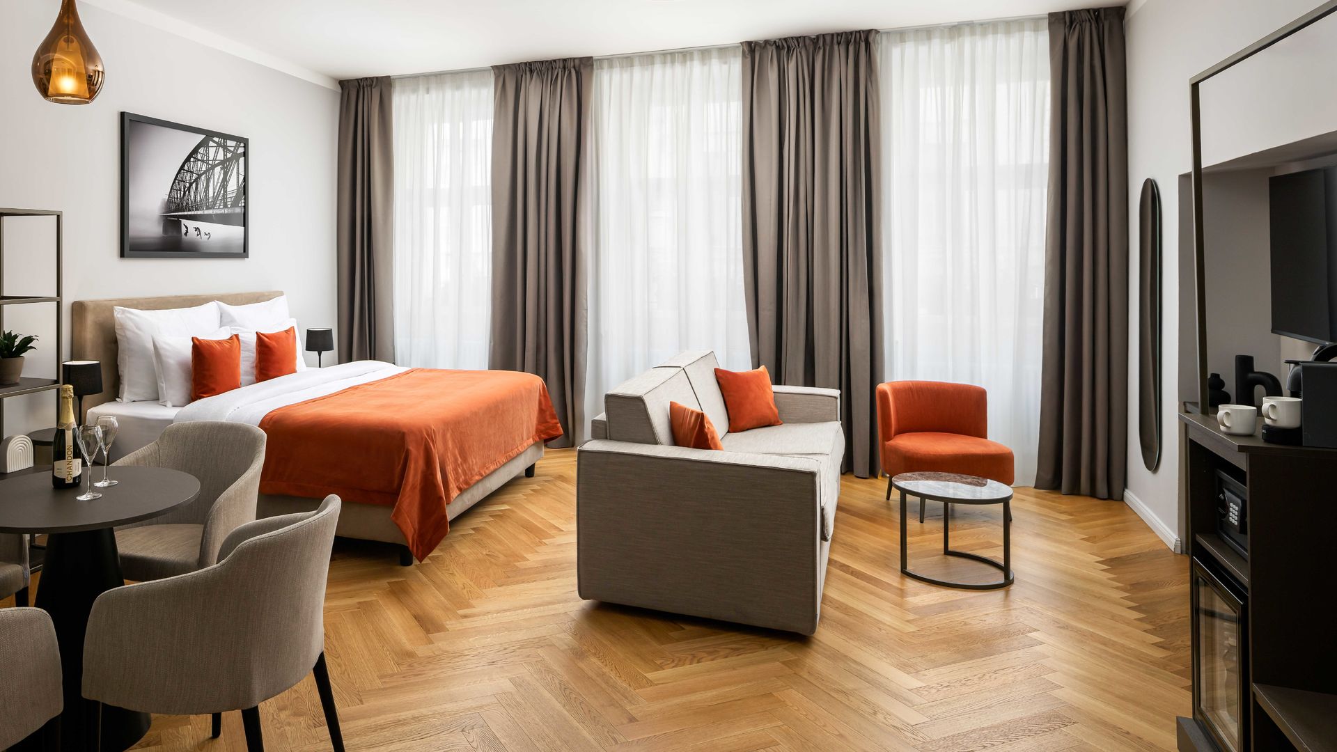 The Bridge is not just a place to stay, but an experience where history meets modern technology – with no reception and a digital check-in, where all information and services are conveniently on your phone. Choose from 11 luxury rooms, from cozy doubles to spacious apartments suitable for groups of five. Thanks to the elevator and peaceful atmosphere, this residence is an ideal sanctuary in the pulsating center of Prague.